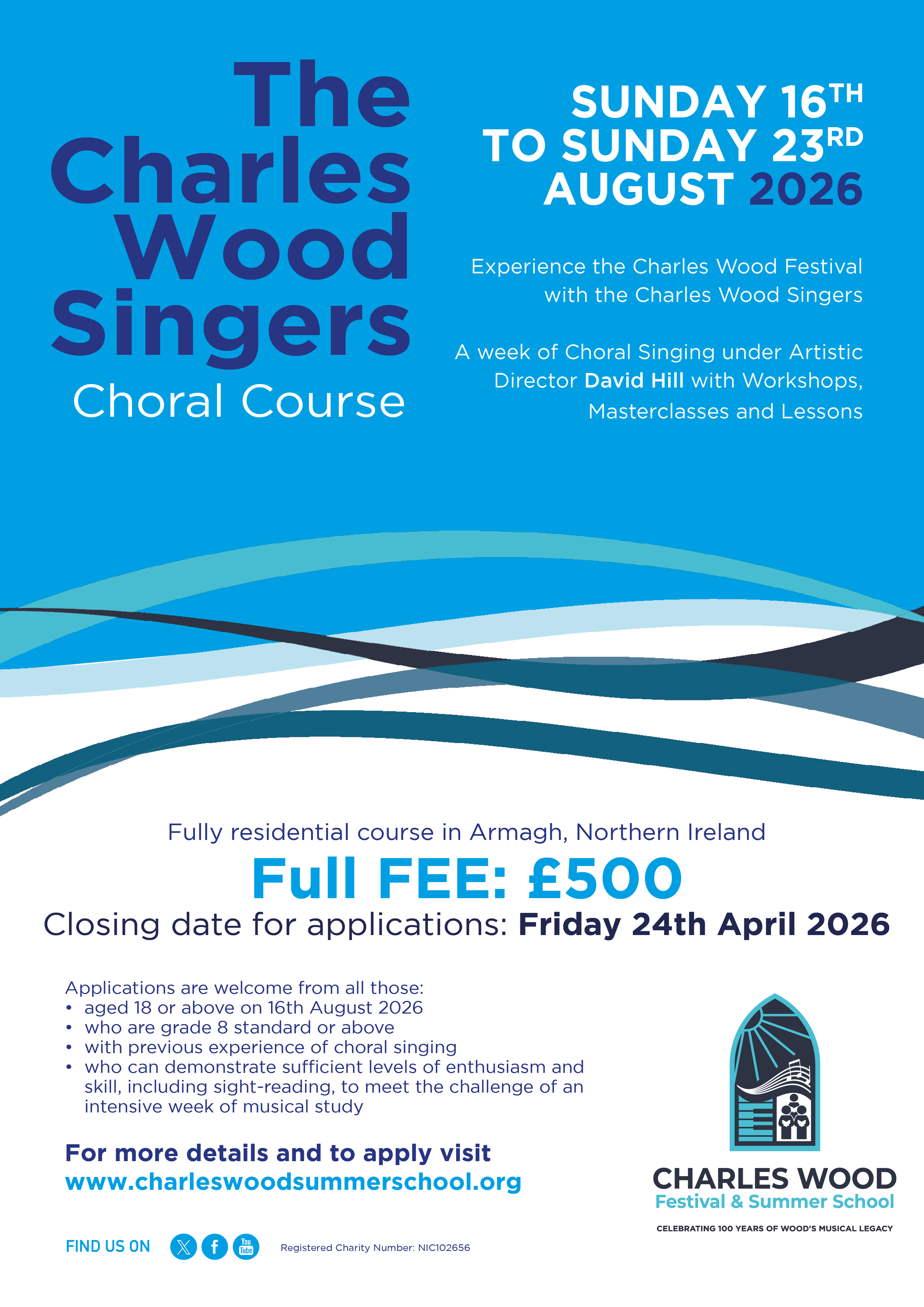 The Charles Wood Singers is a unique choral course which takes place during the Charles Wood Festival of Music and Summer School in Armagh. Participants will have the opportunity to develop their vocal technique, musicianship and ensemble skills under the expert direction of our Artistic Director David Hill (Conductor, The Bach Choir), and our Associate Conductor Philip Scriven (Organist-in-Residence, Cranleigh School).