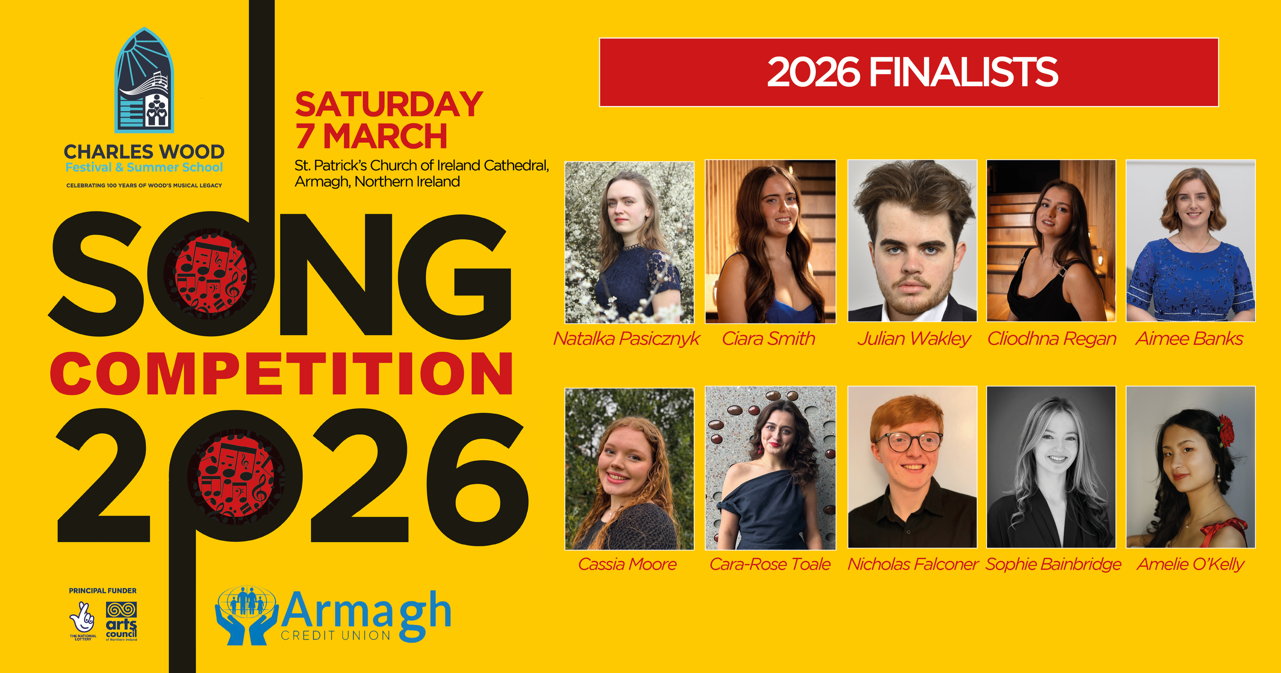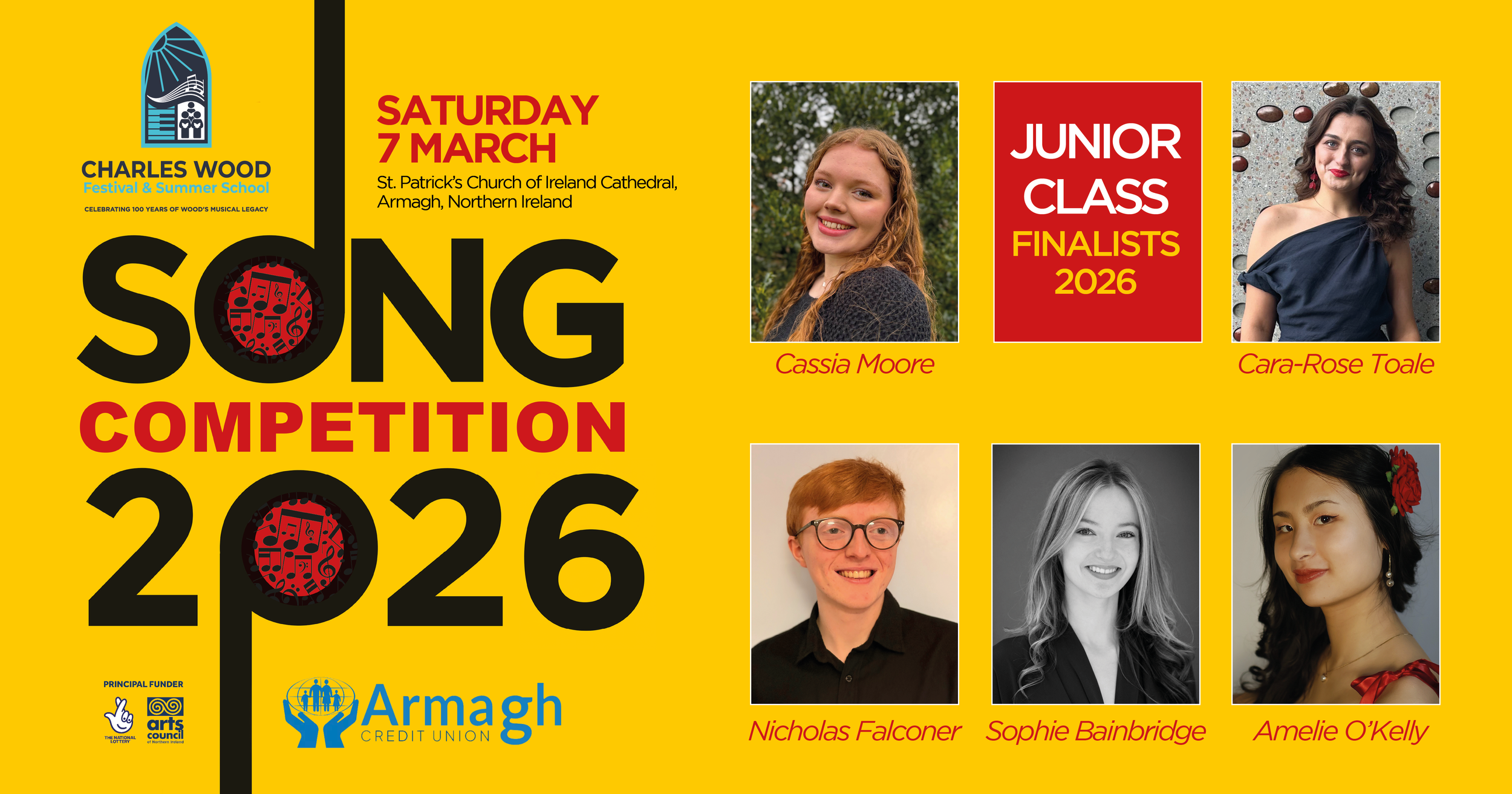 Thanks to the generous support of Armagh Credit Union, the competition boasts substantial cash prizes, including a £1,000 award for the winner of the Senior Class. In addition to financial support, finalists will have the opportunity to win the Dame Felicity Lott Song Prize, awarded for the most engaging performance of a Charles Wood song. Beyond the prizes, the competition provides career-enhancing performance opportunities, making it a key stepping stone for young singers. We’re also indebted to the support and funding from Arts Council Northern Ireland Lottery Funding.